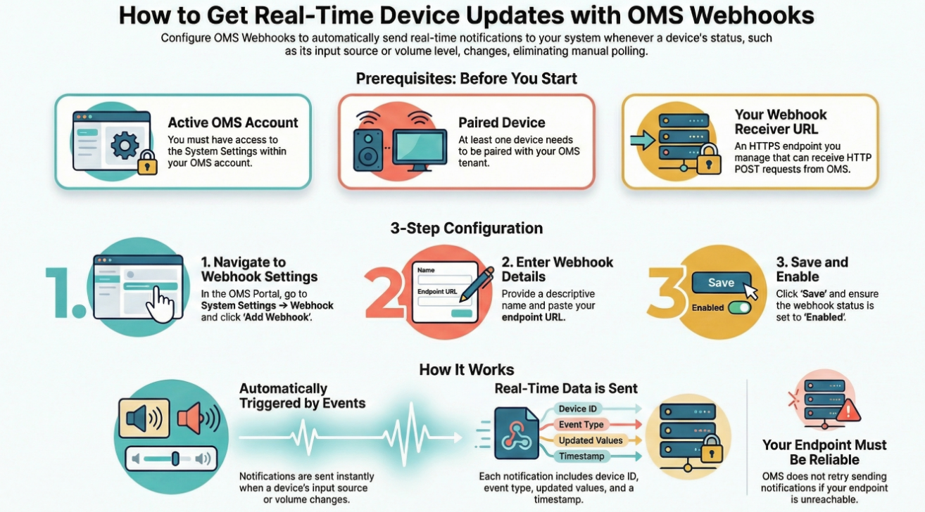 Objective: Learn how to configure a webhook in OMS to receive real-time updates when device status changes (e.g., input source or volume).